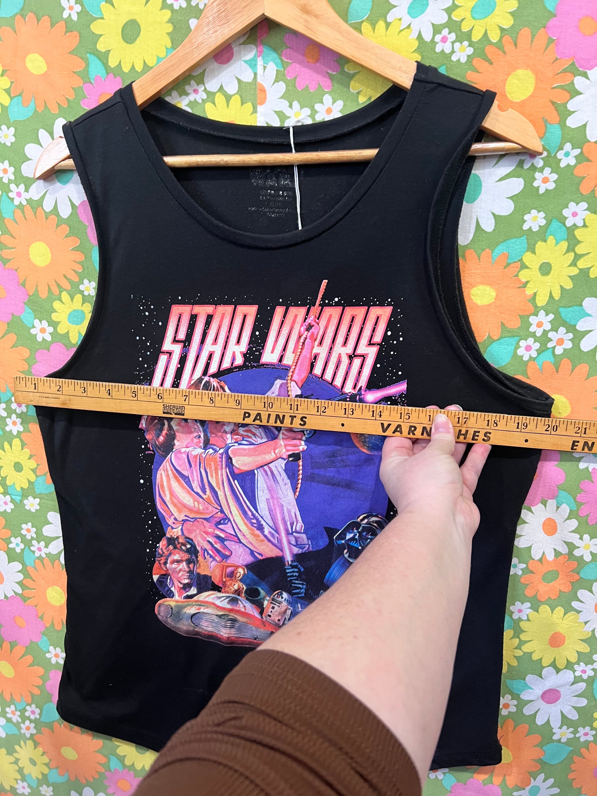 Add this Vintage Star Wars Tank to your wardrobe for a fun and unique piece that will surely spark conversation with your nerd buddies. GUC, with normal wear for its age, this tank will keep the 80's style alive in your wardrobe. May the style be with you! *fits small, some pilling and thinning material due to washing. Small holes under front logo, as seen in photos, and piling.