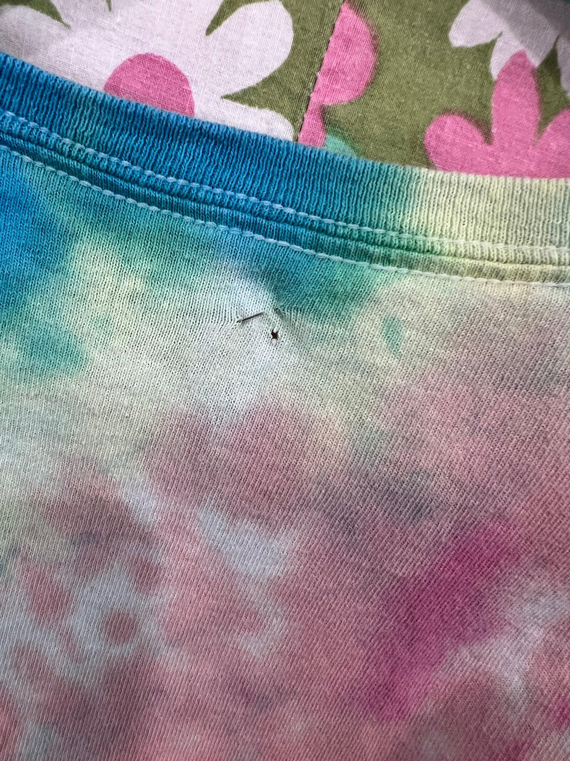 Small pinhole at the back of the shirt by the collar, as seen in photos